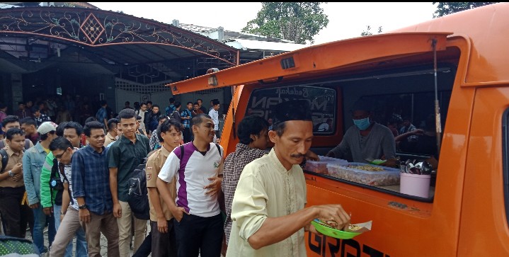 teknokra.co: Usai melaksanakan Salat Jumat (15/2), para jamaah Masjid Alwas’i langsung menyerbu mobil berwarna oranye di parkiran. Kendaraan roda empat tersebut membawa makanan yang dibagikan secara gratis.