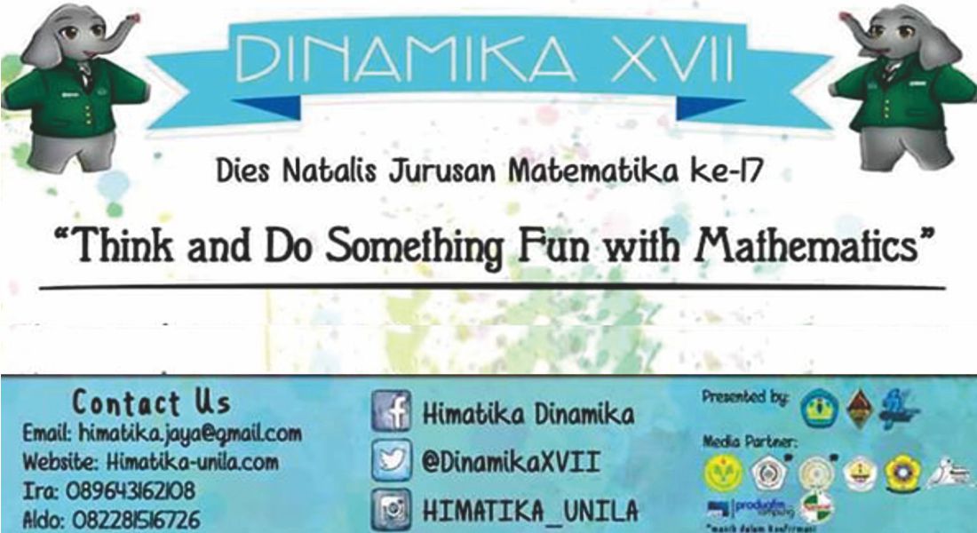 teknokra.co: Menyambut hari jadinya ke-17, Himpunan Mahasiswa Matematika (HIMATIKA) Fakultas Matematika dan Ilmu Pengetahuan Alam (FMIPA) Unila, akan menggelar acara Dinamika XVII (Dies Natalis Jurusan Matematika) pada 5-6 Maret 2016.