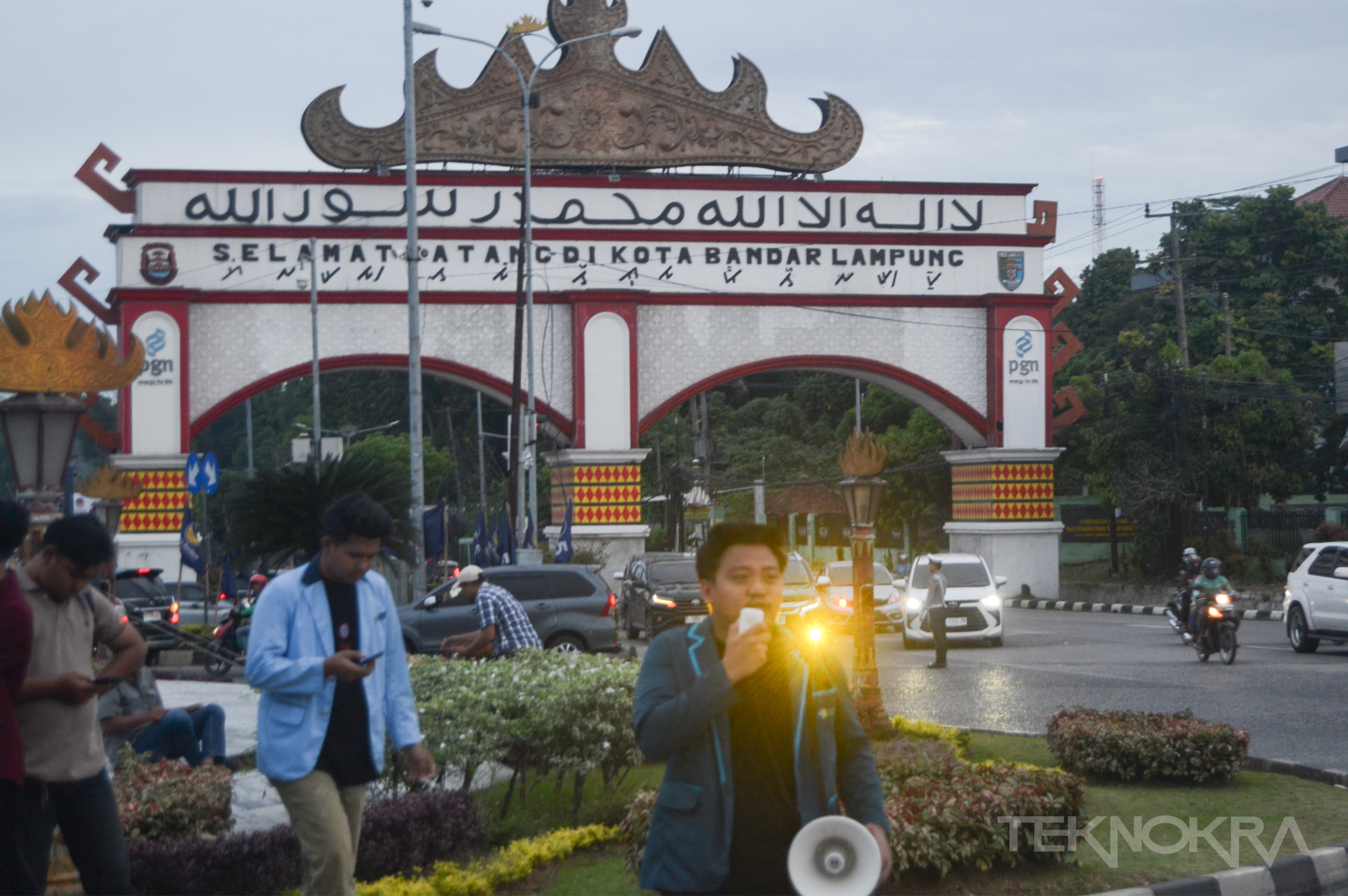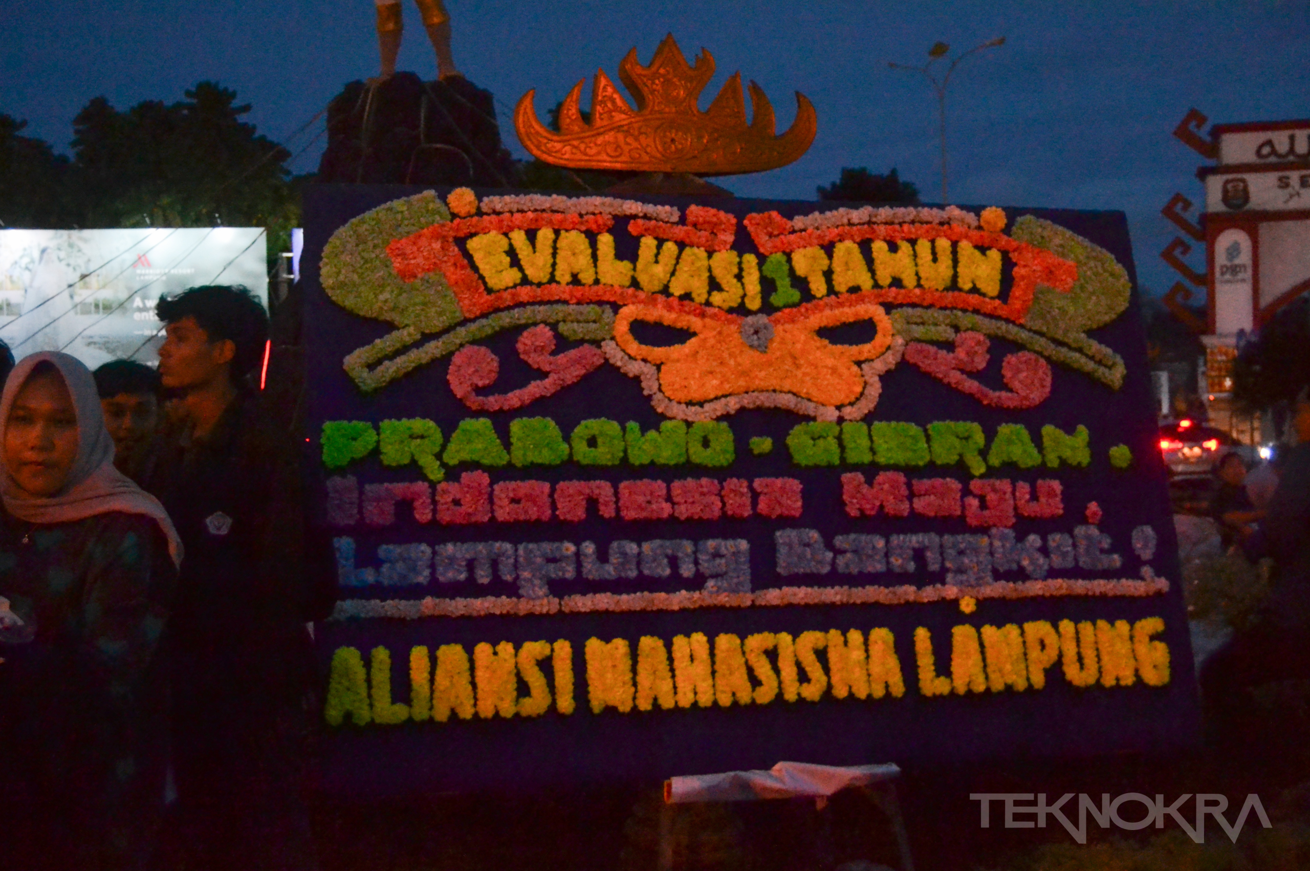 Teknokra.co : Puluhan masa aksi dari Aliansi Mahasiswa Lampung (AML) menggelar aksi simbolik untuk menyoroti kinerja Presiden Prabowo Subianto dan Wakil Presiden Gibran Rakabuming Raka dalam satu tahun terakhir di Bundaran Hajimena, Bandar Lampung, pada Selasa, (28/10).