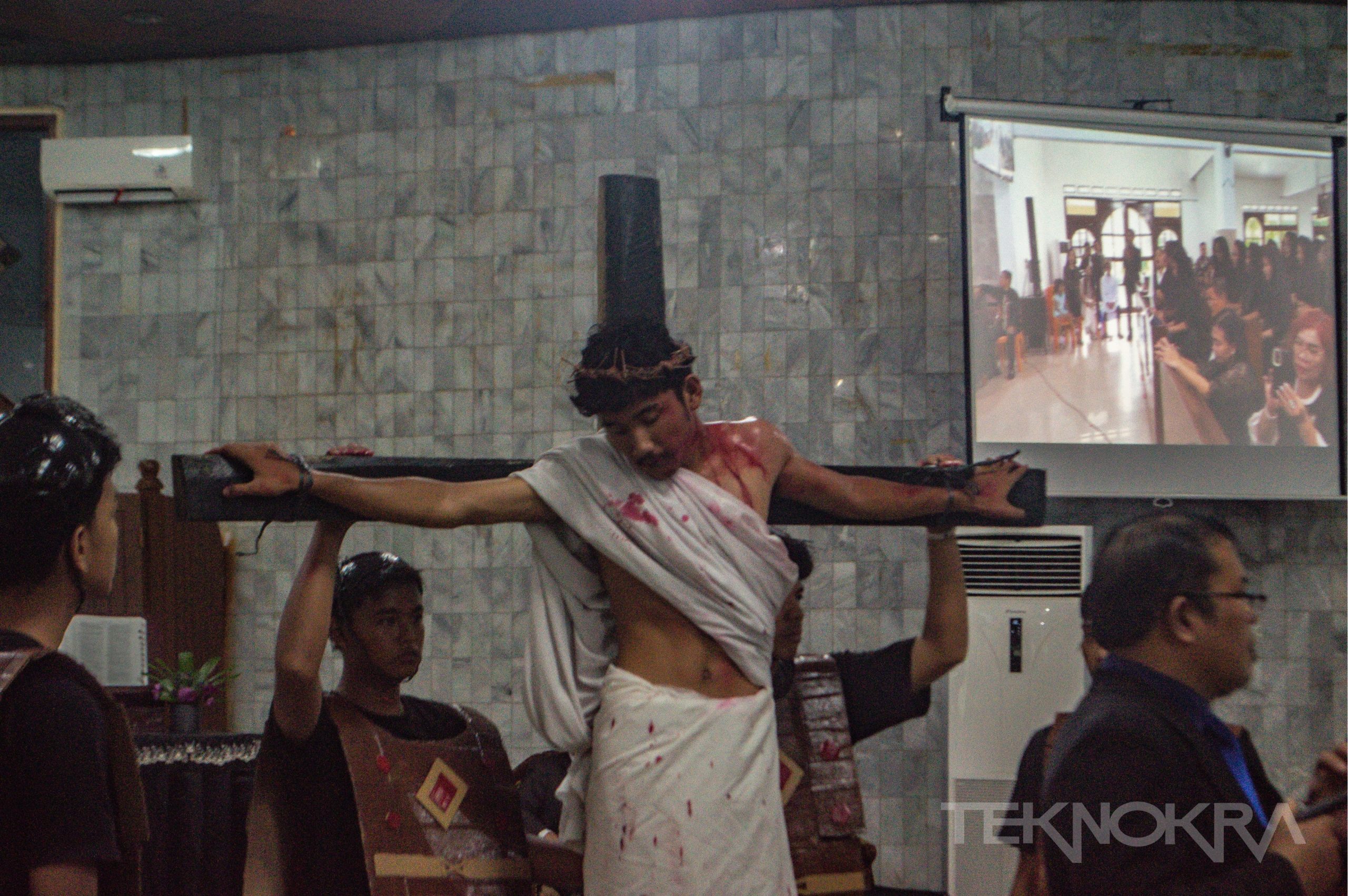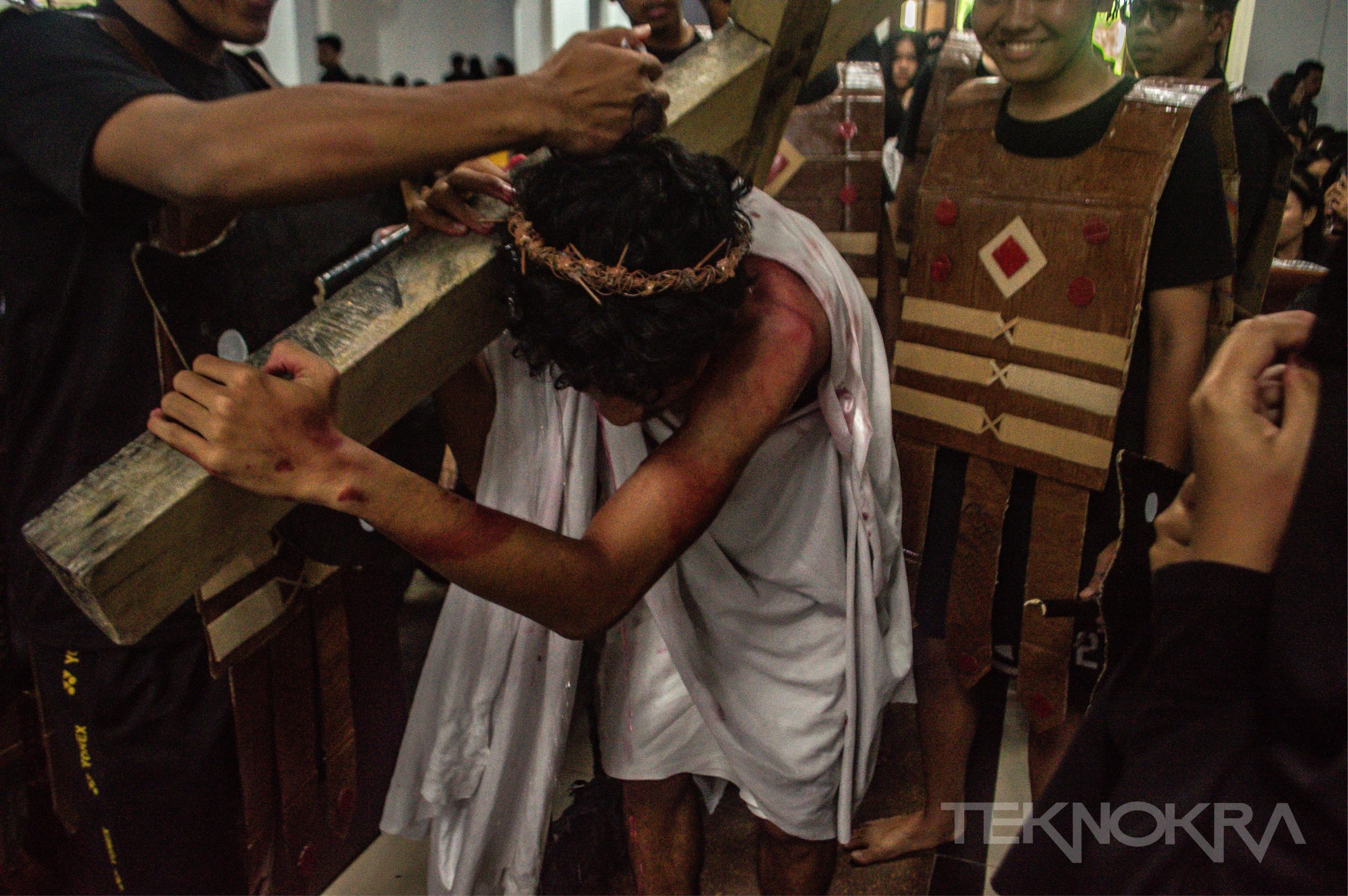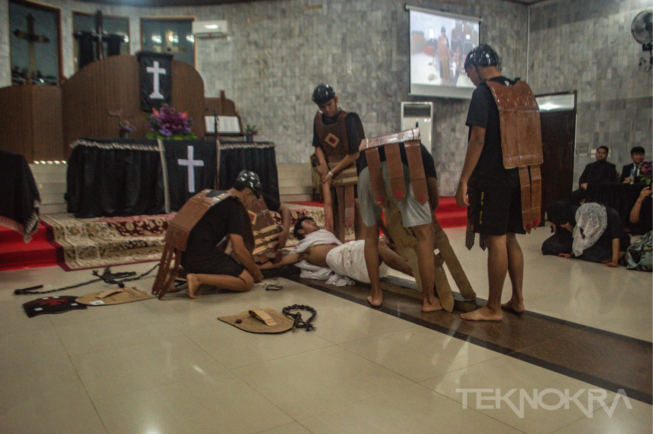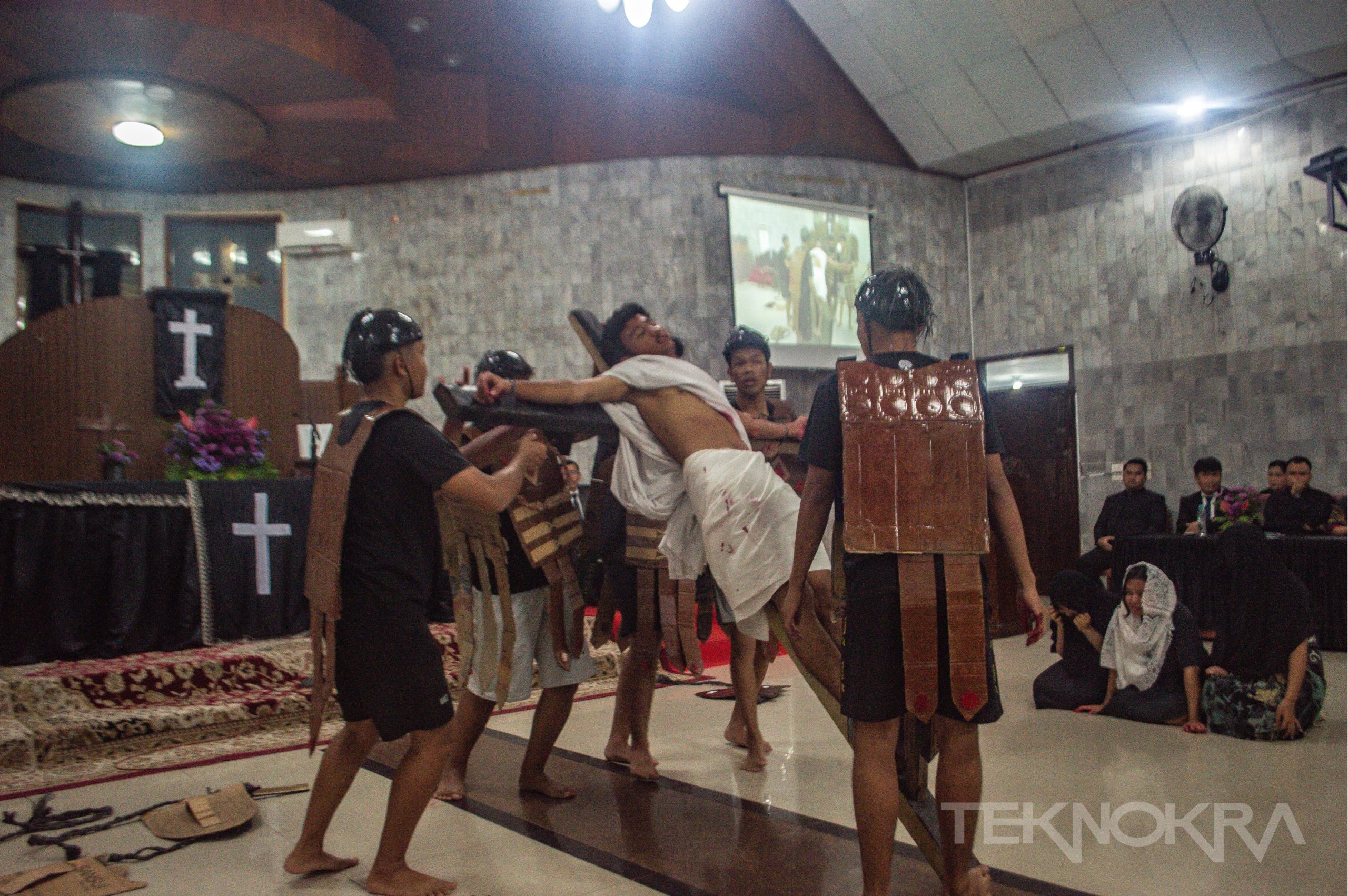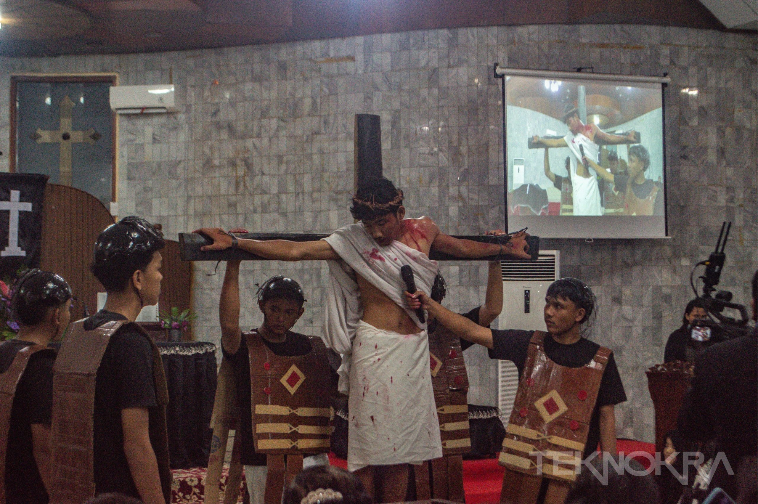 Dalam memperingati Jumat Agung, pemuda Kristen Huria Kristen Batak Protestan (HKBP) Resort Kedaton Bandar Lampung mementaskan drama penyaliban Yesus Kristus sebelum memasuki ibadah pada Jumat, (3/4). Drama tersebut menjadi bagian dari rangkaian refleksi iman untuk mengenang pengorbanan Yesus Kristus di kayu salib.