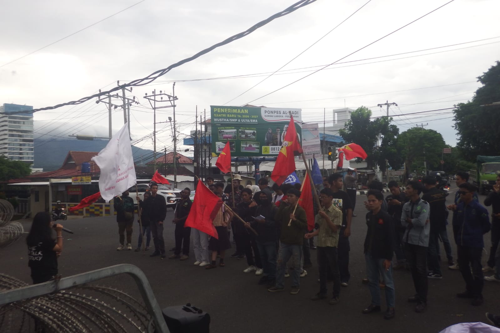 “Sempat ada sedikit gesekan dengan polri, karena kita memaksa untuk masuk untuk melakukan diskusi, aksi pencerdasan di pelataran gedung DPRD. Namun, polri menghalangi kita. Kita sudah melakukan konsolidasi dan negosiasi tapi tetap tidak bisa. Dan terjadi dorong-dorongan sampai ada dorongan yang keras,” ujar Jane Elizabeth selaku korlap.