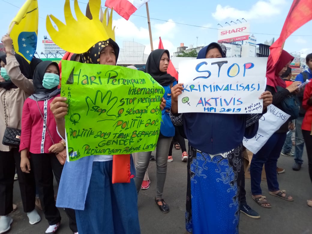 teknokra.com: Rizky Gita Ramadhani (Women’s March Lampung) bersama puluhan aktivis perempuan lainnya, menuntut pengesahan Rancangan Undang-Undang Penghapusan Kekerasan Seksual, dan Politik Elektoral dalam aksi peringatan Hari Perempuan Indonesia (HPI) di Tugu Adipura Bandarlampung, Jumat (8/3/2019).
