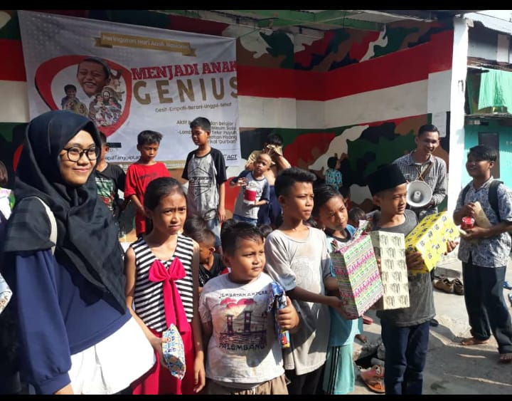 teknokra.co: Komunitas Ruang Sosial memperingati hari anak nasional di Kampung Pesawaran, Teluk Betung Selatan, Bandarlampung, Senin (23/7). Dalam acara bertema “Menjadi Anak Genius” ini, anak-anak melakukan permainan edukatif untuk memahami agama melalui sejarah teatrikal kurban.