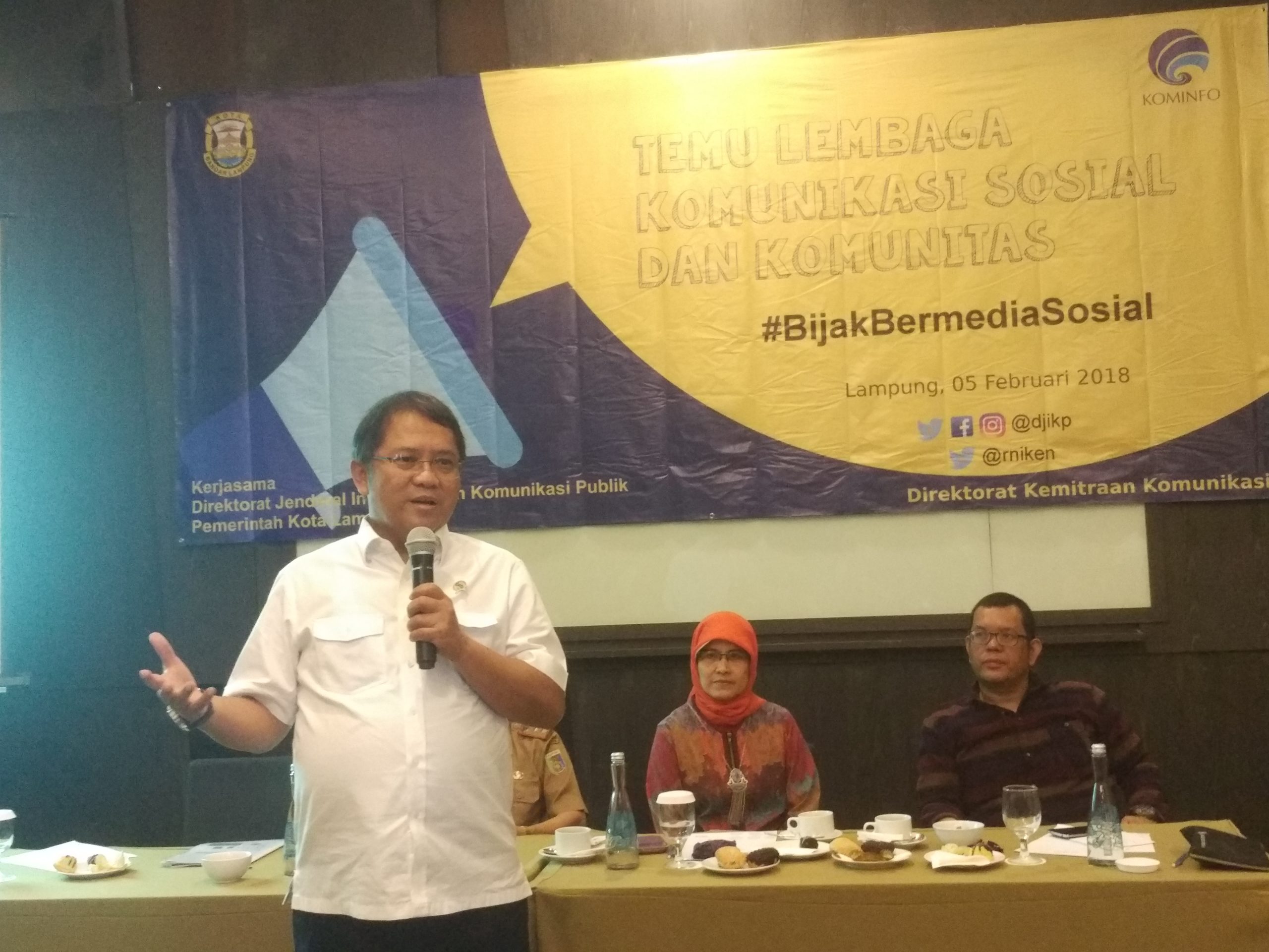 “Saya mengapresiasi, karena ini adalah akar penggerak komunikasi. Sebagai jembatan informasi publik dengan pemerintah,” ucapnya. Ia juga menyatakan media sosial harus ada interaksi, mampu menyerap aspirasi masyarakat. Tak ketinggalan, Ia juga mengingatkan peserta diskusi untuk segera melakukan registrasi kartu prabayar.