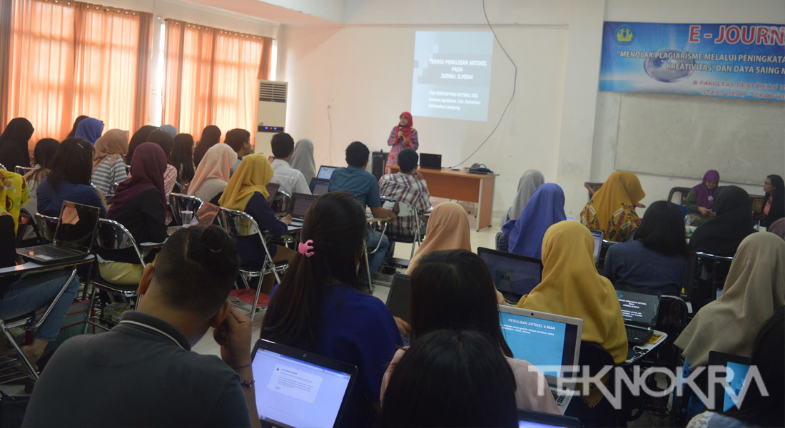 teknokra.co: Sebanyak 90 peserta yang merupakan mahasiswa Jurusan Agribisnis angkatan 2012, mengikuti pelatihan e-journal, di Ruang D 302, Pada Minggu, 30 April 2016. Pelatihan yang bertema “Menolak Plagiarisme Melalui Peningkatan Kualitas Karya Ilmiah, Kreativitas, dan Daya Saing Mahasiswa” ini dihadiri oleh Dr. Fembriati Erry Prasmatiwi (Ketua Jurusan Agribisnis), Dr. Yaktiworo Indriani (Ketua Jurnal Ilmu-ilmu Agribisnis), Ir. Indah Nurmayasari (Sekertaris Jurusan) dan beberapa dosen yang tergabung dalam Tim Jurnal Ilmu-ilmu Agribisnis (JIIA).