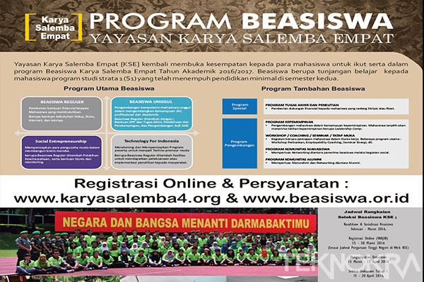 teknokra.co: Kabar gembira untuk mahasiswa Unila yang sedang berburu beasiswa. Karya Salemba Empat (KSE) membuka kesempatan bagi mahasiswa untuk ikut serta dalam program beasiswa reguler KSE tahun akademik 2016/2017.