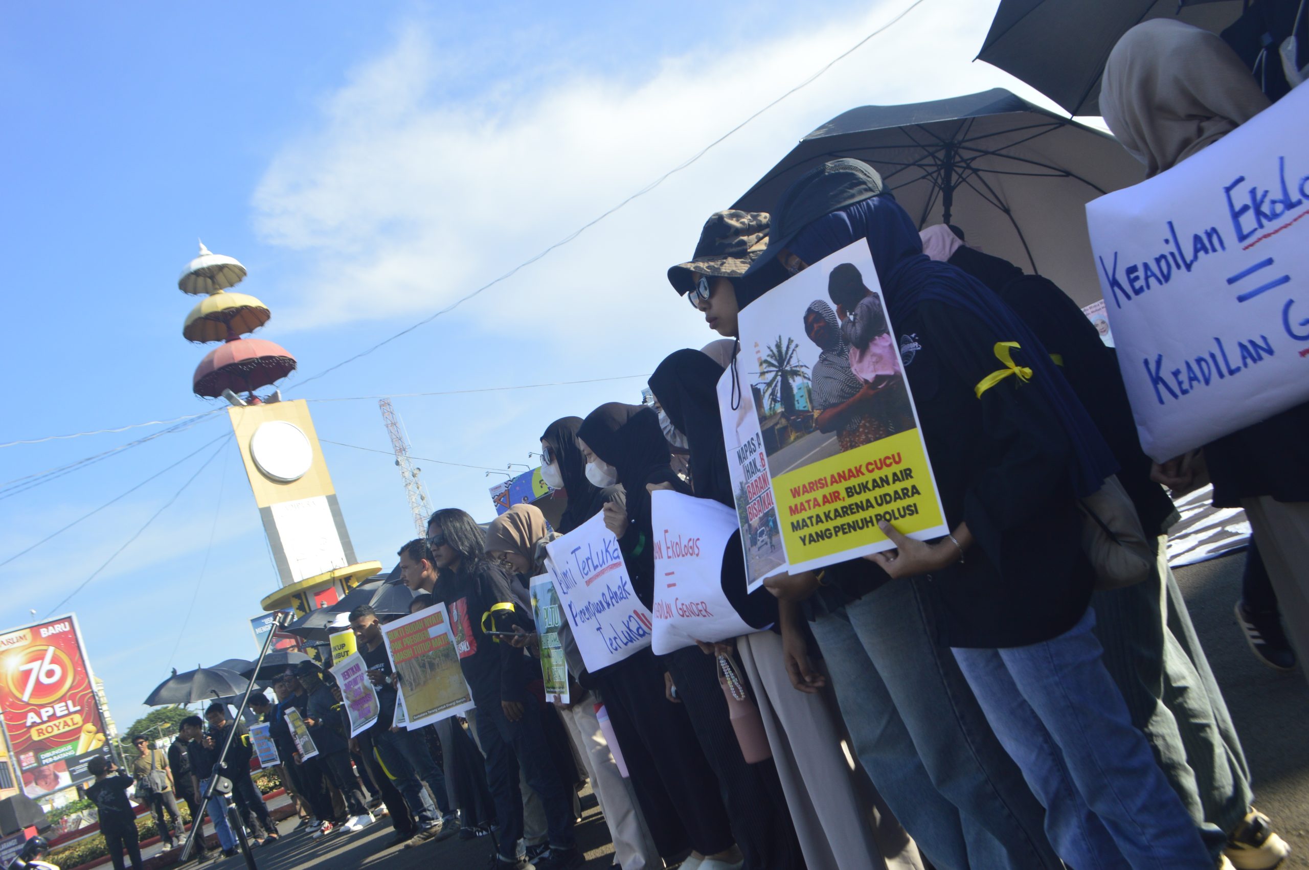 Teknokra.co : Kerusakan lingkungan menjadi persoalan yang belum terselesaikan di Pulau Sumatera. Salah satunya adalah banjir yang terus terjadi di Bandar Lampung selama tiga tahun berturut-turut. Menyoroti polemik kerusakan lingkungan di Sumatera sekaligus memperingati Hari Bumi, Aliansi Rakyat untuk Keadilan Ekologis menggelar aksi simbolik di Tugu Adipura, Bandar Lampung, pada Rabu, (22/4).