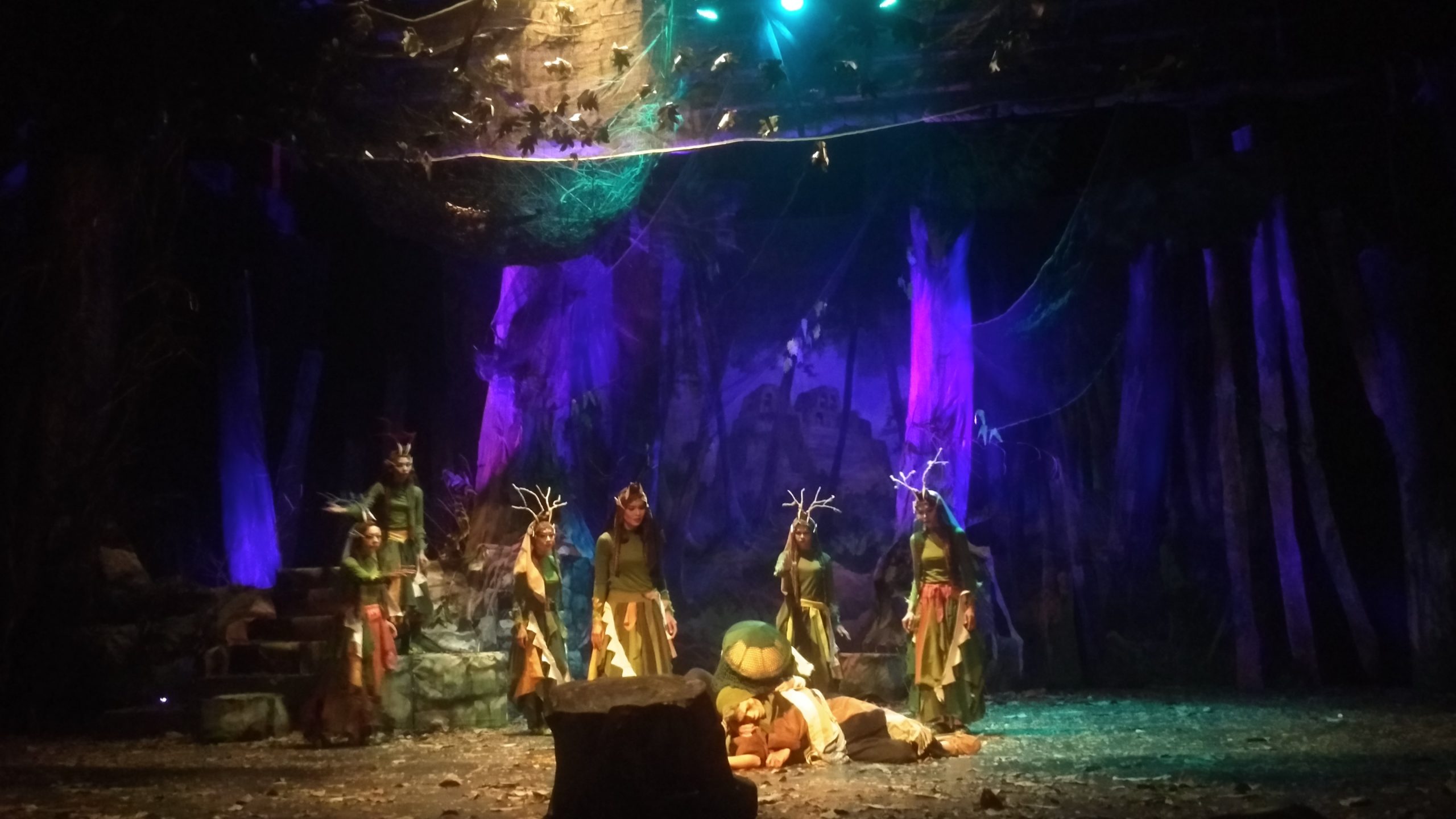 Lantunan lagu masa kecil disenandungkan Ismene dalam gelapnya hutan keramat. Panggung itu disulap seperti hutan, dengan pohon di depannya. Daun-daun kering memenuhi lantai, lengkap dengan batu, lukisan pepohonan, dan jala-jala yang dibentangkan secara horizontal bertempelkan daun semi. Suasana hutan yang sepi, membuat lantunan lagu itu menyayat hati Antigone. Terkenang masa kecil ketiga saudaranya. Yang sedih dan menanti Polynesis mengahadap ayah.
