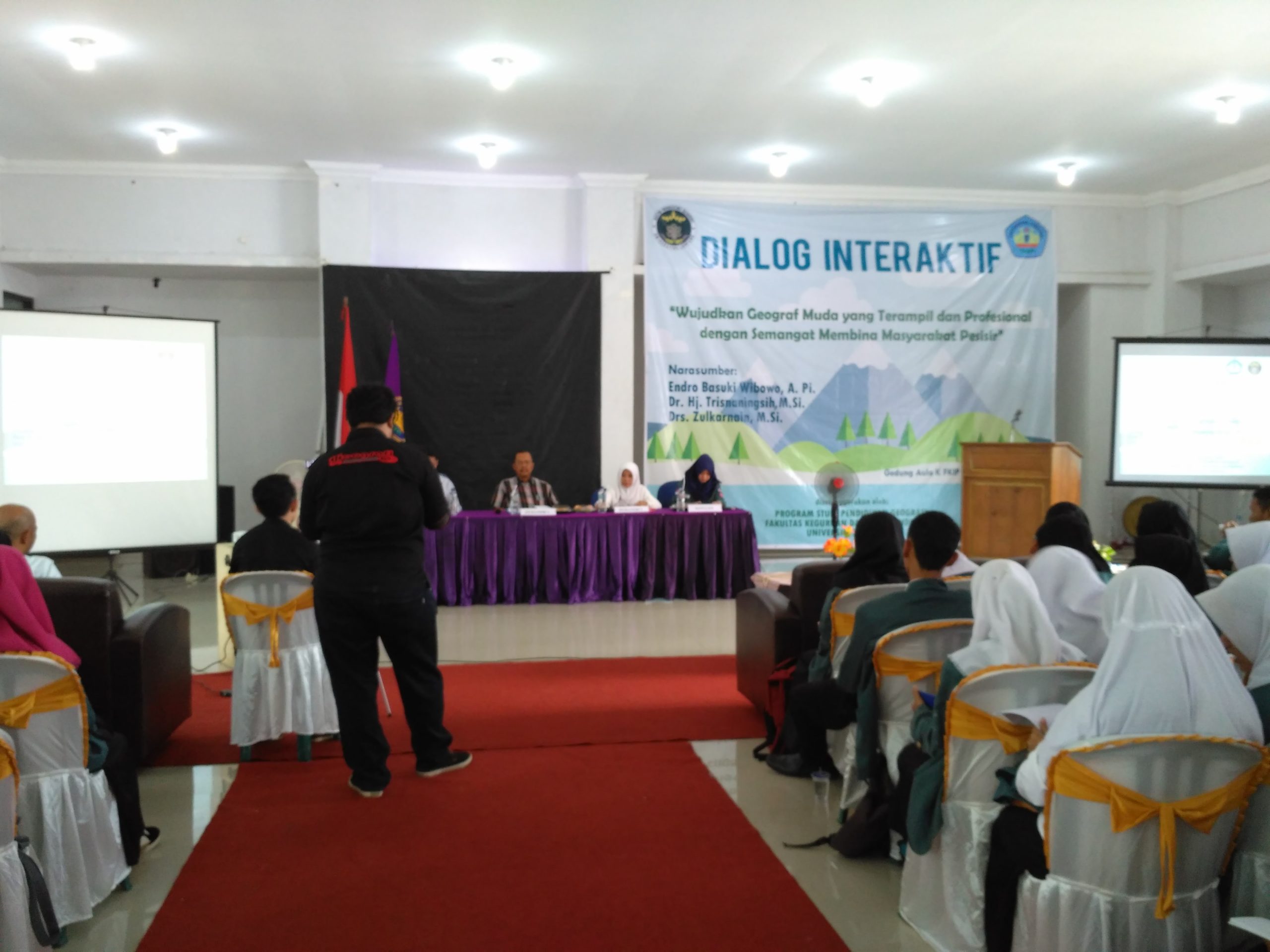 Dialog interaktif ini menghadirkan pemateri Endro Basuki Wibowo, Kepala Bidang KP3K PSDKP Dinas Kelautan dan Perikanan Provinsi Lampung dan Kepala Prodi Magister Pendidikan IPS FKIP Unila, Trisnaningsih. Serta dihadiri oleh mahasiswa Pendidikan Geografi angkatan 2011-2016.