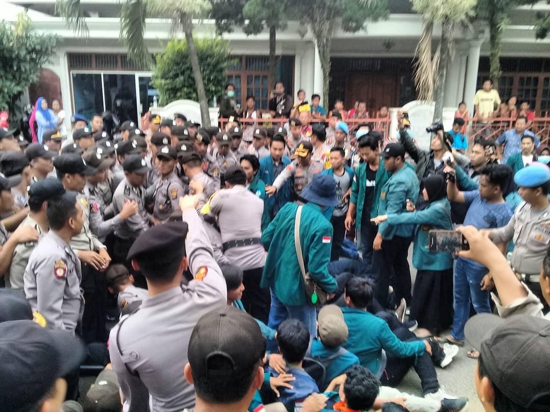 Awalnya aksi yang diikuti puluhan mahasiswa yang berasal dari Badan Eksekutif Mahasiswa (BEM) Unila, Polinela, dan Poltekes Tanjung Karang berjalan kondusif. Namun, terjadi saling dorong dengan polisi berjumlah 200 personil.