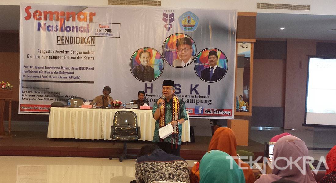 Pemateri terakhir Taufiq Ismail yang disambut antusias sejak memasuki ruangan seminar menyampaikan pada zaman masa penjajahan dulu, siswa AMS (setara SMA) Hindia Belanda-A di Yogyakarta(1939-1942)diwajibkan membaca 25 judul buku sastra dan AMS Hindia Belanda di Malang (1929-1932) siswa diwajibkan membaca 15 buku sastra “Jumlah ini setara dengan jumlah buku yang harus dibaca siswa SMA Di negara maju seperti Jerman,Jepang, Swis, dan Amarika Serikat. Artinya justru di zaman penjajahan kita bisa bersaing dengan negara maju itu dalam soal sastra,” jelasnya.