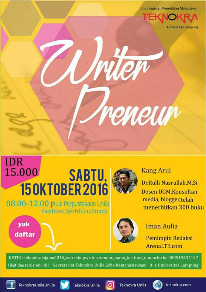 Kegiatan berlevel nasional tersebut akan dibuka dengan workshop writerpreneur pada 15 Oktober di Ruang Auditorium Perpustakaan Unila. Kali ini Teknokra menghadirkan Kang Arul (Bloger) dan Imam Aulia (pemimpin redaksi) Arenalte.com untuk memberikan pengetahuan dan pengalaman dalam menghasilkan tulisan yang dapat memperoleh penghasilan.