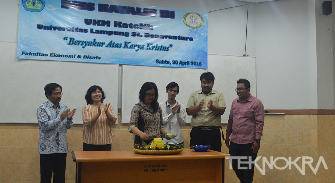 teknokra.co: UKM Katolik rayakan Dies Natalis yang ke III, di Gedung E102 FEB Unila, Sabtu (30/4). Acara dimulai dengan Misa Kudus yang dipimpin Romo Thomas Aquino Imam. Acara tersebut dihadiri dewan pembina UKM Katolik, Gregorius Susanto (Dosen FMIPA), Diana Rosita (Dosen Pendidikan Bahasa Perancis), FX Sumarja (Dosen Fakultas Hukum) dan beberapa tamu undangan lain.
