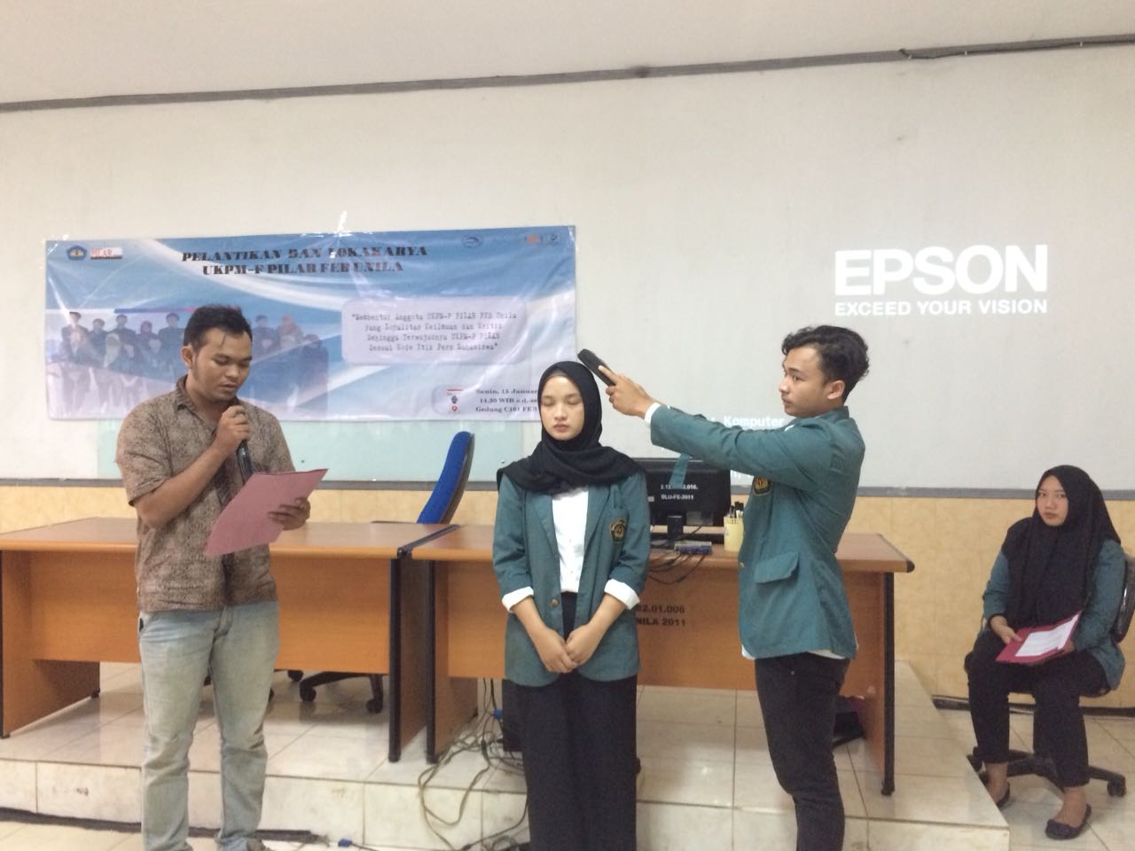 teknokra.co : UKPM-F Pilar FEB Unila kini memiliki wajah baru dalam roda organisasinya. Dr. Ambya selaku Wakil Dekan Bidang Kemahasiswaan dan Alumni FEB Unila melantik 10 anggota baru UKPM-F Pilar periode 2017/2018 di gedung C101, FEB Unila, Senin (15/1). Pelantikan sekaligus Lokakarya tersebut dihadiri oleh alumni dan Aliansi Pers Mahasiswa se-Lampung.