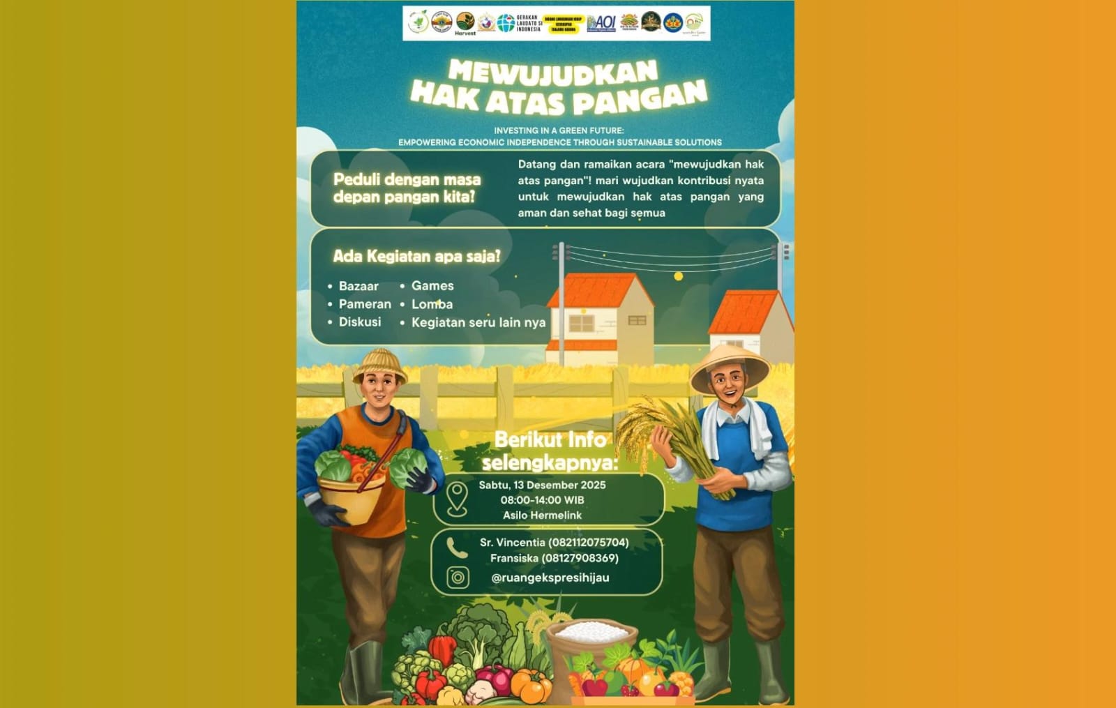 Sebagai upaya meningkatkan perhatian dan kesadaran masyarakat terhadap pentingnya pertanian berkelanjutan yang adaptif dan berkeadilan, kegiatan “Mewujudkan Hak Atas Pangan” akan diselenggarakan di Asilo Hermelink, Jalan Z.A. Pagar Alam No.18, Gedong Meneng, Rajabasa, Kota Bandar Lampung pada Sabtu, 13 Desember 2025. Acara ini akan berlangsung mulai pukul 08.00 hingga 14.00 WIB.